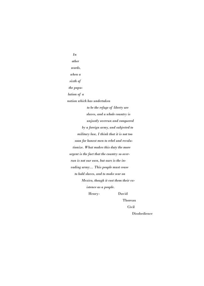 These were some of the words Henry-David Thoreau wrote in his essay Civil Disobedience (Resistance to Civil Government) published in 1849. The text has been shaped in the form of the disputed territory in the war.